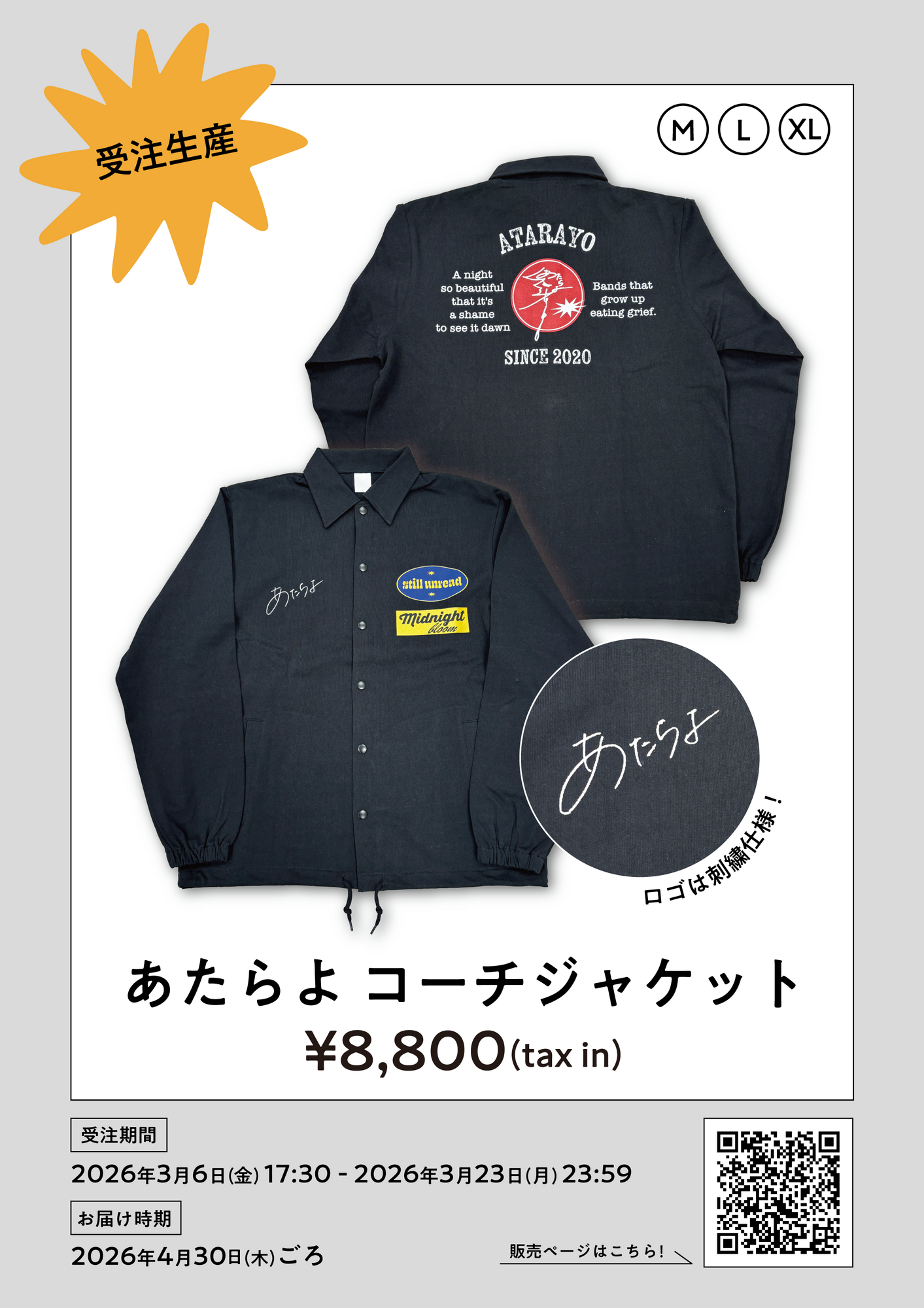 ファンクラブライブ2026「アタラ場」の開催を記念して、本日より「あたらよ コーチジャケット」の受注販売開始!