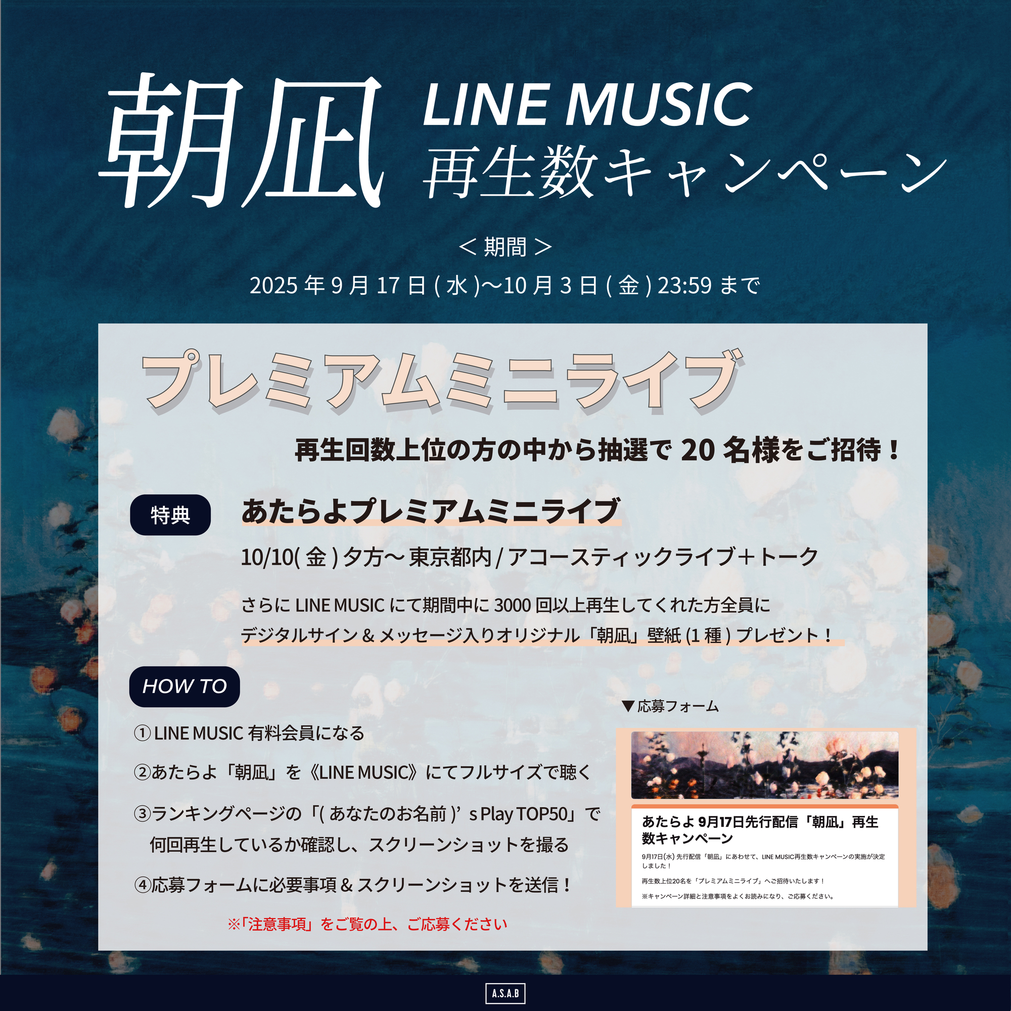 LINE MUSICで「朝凪」をたくさん聴いてくださった、再生回数上位の方の中から抽選で20名様を、プレミアムミニライブにご招待いたします!ぜひご参加ください!